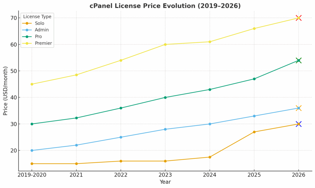 In less than six years, the Premier plan price has climbed from $45 to nearly $70, while the Solo license has almost doubled. For many long-time hosting providers, the steady upward trend has turned what was once a predictable operating cost into a growing financial strain — one that’s forcing smaller players to rethink their toolsets, automation stacks, and even business models.