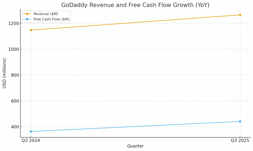 GoDaddy’s third quarter 2025 results show a company that continues to balance growth, profitability, and technological transition with discipline. Total revenue reached $1.3 billion, representing a 10% year-over-year increase, while operating income rose 17% to $296.7 million. The company’s free cash flow climbed to $440.5 million, up 21% from the same period last year.