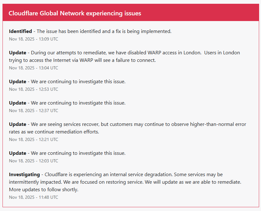 Cloudflare confirms that its dashboard, API, and parts of its edge network are failing. During ongoing recovery efforts, the company temporarily disables Cloudflare WARP access in London to stabilize the system. As a result, users in that region cannot connect through WARP at all. By early afternoon UTC, Cloudflare states that it has identified the root cause and is rolling out a fix. Services begin to recover, though error rates remain higher than normal.