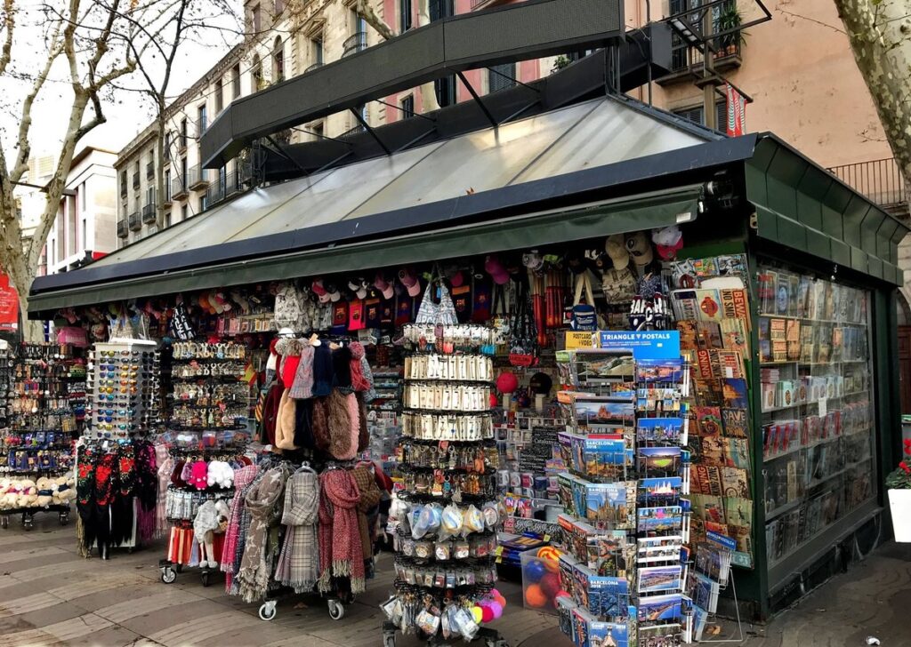 And the more I paid attention, the more I realised something interesting: kiosks in Barcelona have quietly split into two very different worlds. What used to be a simple, almost-commodity service selling newspapers, magazines, or a bottle of water has — dramatically — evolved into something completely non-sense and ridiculous in some cases. Some kiosks stayed exactly as they were and then slowly turned into these chaotic “La Rambla stalls,” piling up anything they think a tourist might buy: sangria bottles in ugly plastic bull-shaped bottles, flamenco fridge magnets, fake Barça shirts, “I ❤️ Barcelona” mugs that might end up on another random shelf… basically a wall of randomness. They try to appeal to everyone, and end up speaking to NO ONE.