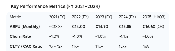 • ARPU keeps rising, moving from the low-€13 range earlier in the decade to the €16,6 2025,