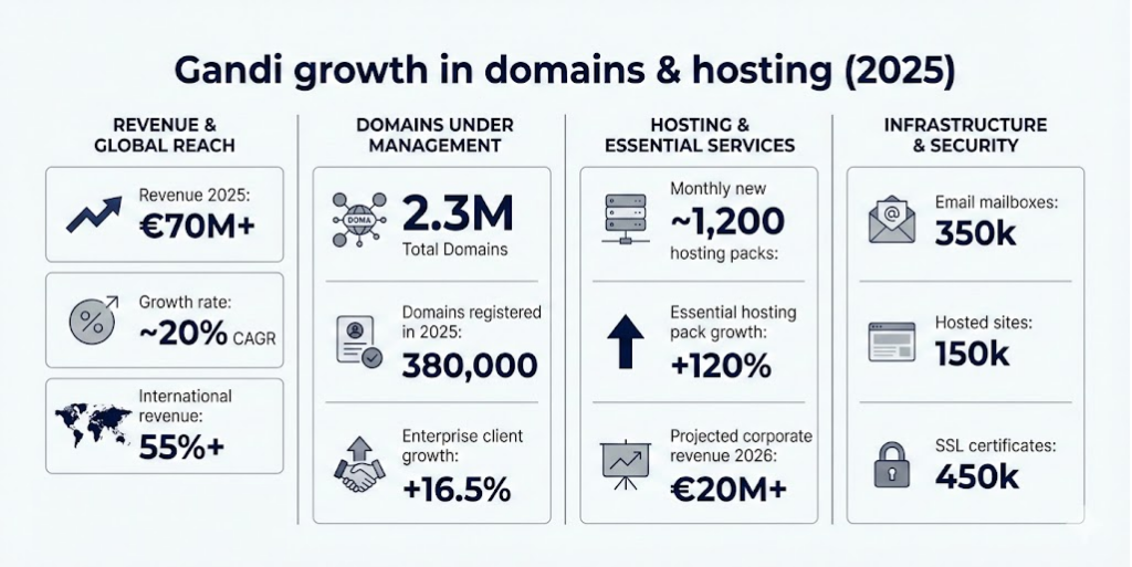 Retail and reseller activity is still healthy. Gandi reports strong monthly growth in new customer acquisition and hundreds of thousands of new domain registrations in 2025. Hosting bundles, particularly the “Essential” pack, are finally showing traction.