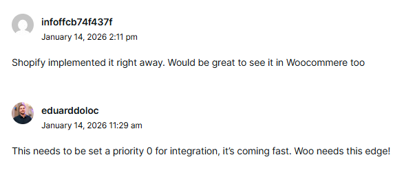 The WooCommerce community has already reacted. A public feature request for native UCP support is live, with early discussion following: