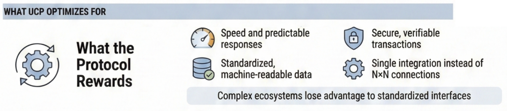 UCP doesn’t remove operational responsibility, but it significantly reduces integration complexity by standardizing how commerce systems talk to each other.