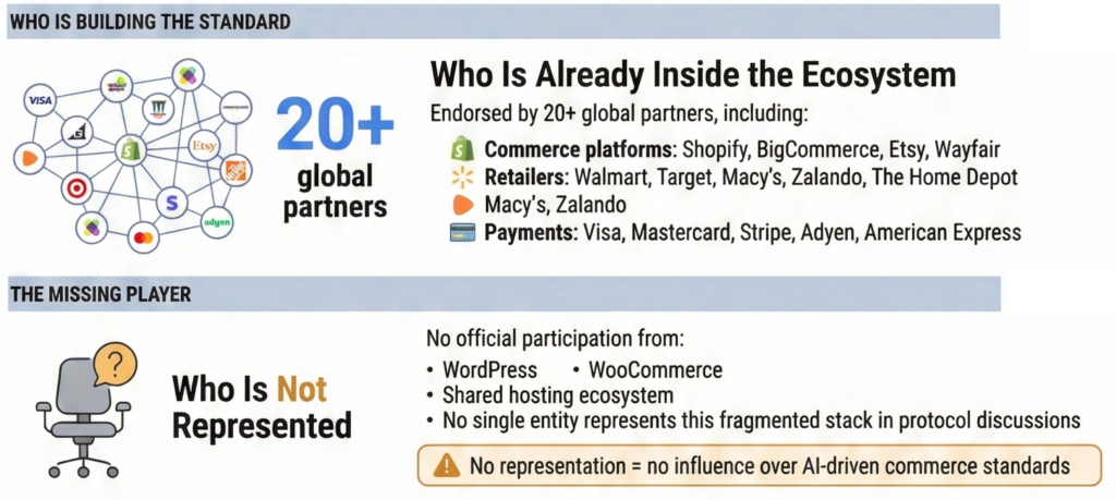 TL;DR – Google published a new commerce protocol designed for AI agents, not humans. Major SaaS platforms are already aligned. WordPress and WooCommerce are not part of the process yet. The issue isn’t technology, only how fast different models (SaaS vs standalone) absorb change.