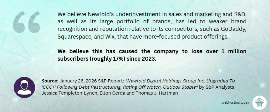So when S&P writes “We believe the company has lost over 1 million subscribers (roughly 17%) since 2023” it is an analyst conclusion based on Newfold’s non-public data, S&P’s internal models and cross-checks against public information.