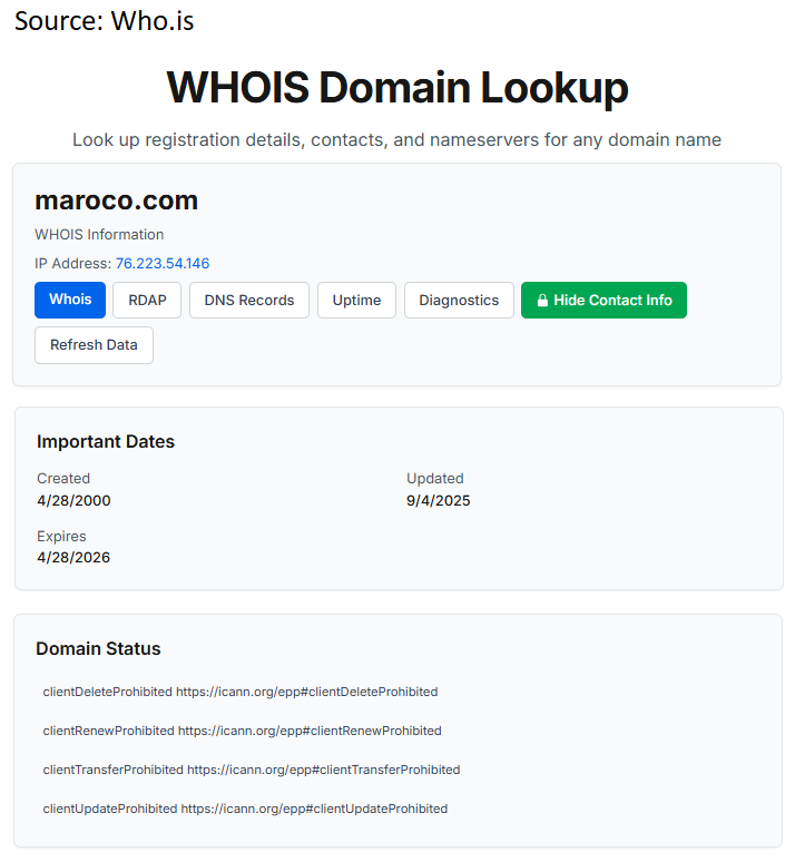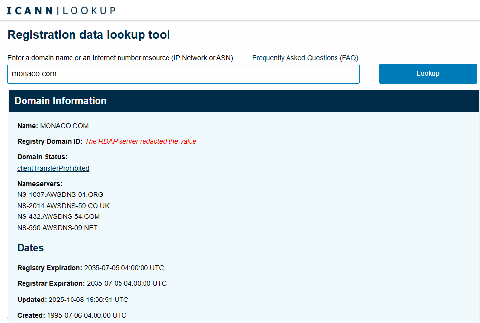 As for 02.02.2026 domain monaco.com is still blocked (in ICANN it has status clientTransferProhibited since 08.10.2025), and according to Whi.is domain status is blocked for all actions: