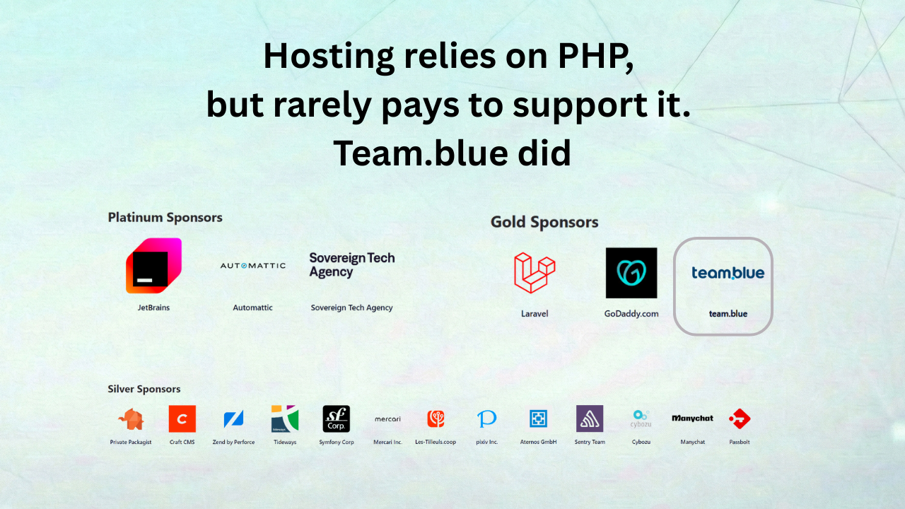 TL;DR – at the end of January 2026, team.blue, one of the largest hosting groups in Europe, announced that it would start financially supporting the PHP Foundation as a Gold Sponsor. On its own, this is a small, almost technical announcement. The contribution (12.000$/year) does not change PHP’s roadmap, nor does it materially alter the economics of the hosting market.