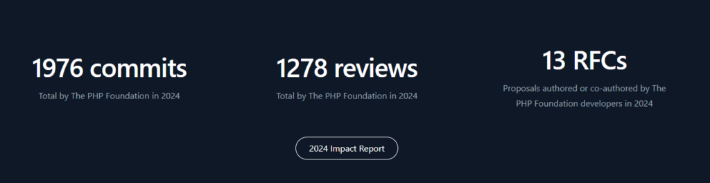 In 2024, the Foundation reported that it raised $685,350 and contracted 10 part-time and full-time developers responsible for a substantial share of PHP core work. They delivered 1,976 commits, 1,278 code reviews, and 13 implemented RFCs in a single year.