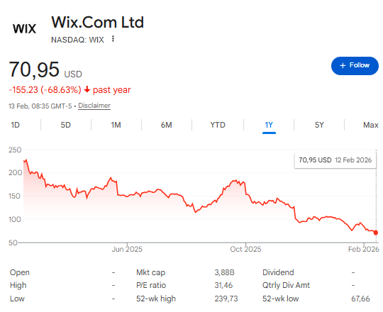 Wix closed at $70.95 on February 12, 2026. In January 2025, the stock was trading around $240–$247 per share and the 52-week high stands at $239,73. From that peak to $70.95, the decline is approximately -68%.