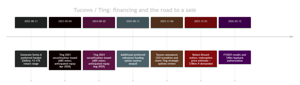 The post‑Ting Tucows story lives or dies on a handful of measurable, non-glamorous items. The key isn’t press commentary it’s documents. Watch for an 8‑K with sale terms, treatment of Ting ABS debt, and how the preferred holder Generate TF Holdings, LLC is handled – especially given the ~$186m redemption-price estimate if redemption is demanded.