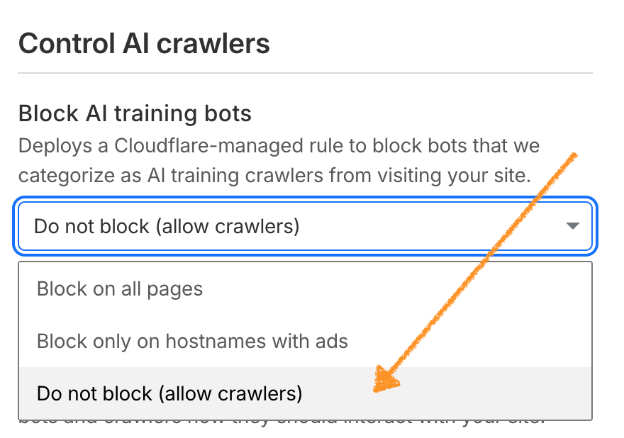 Firewall and bot management tools like Cloudflare can inadvertently block AI crawlers if configured too aggressively. If you use Cloudflare, then it’s worth auditing your settings to confirm that AI crawlers are set to Allow rather than Block or Challenge, as shown in the screenshot below.