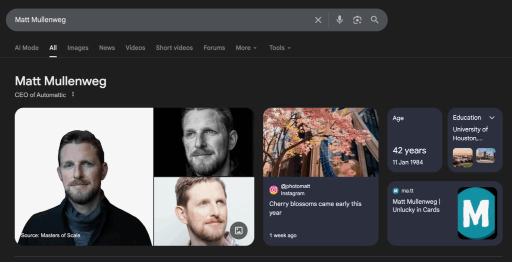 Below is a screenshot of the Knowledge Person Panel for Matt Mullenweg, the creator of WordPress, when you search for his name. This is powered by Google Knowledge Graph.