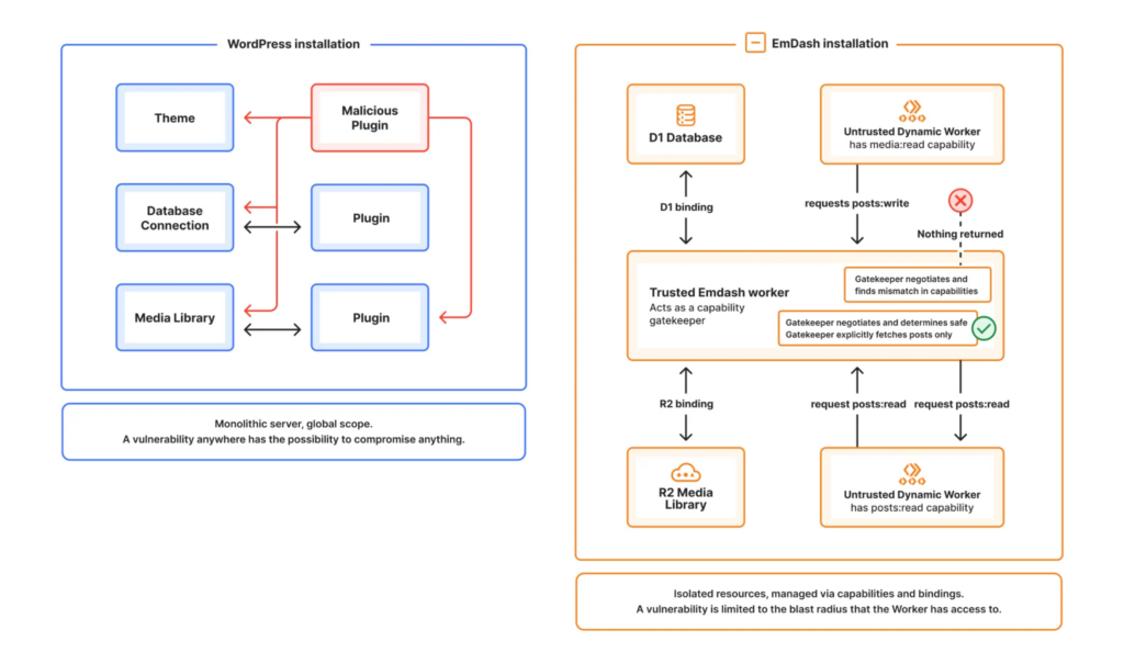 Cloudflare’s positioning for EmDash is direct: “96% of security issues for WordPress sites originate in plugins.” That number is the product’s entire thesis. WordPress plugins run in the same PHP process as the core application, sharing database access, filesystem access, and execution context. A compromised or malicious plugin can reach everything. This is not a WordPress-specific failure; it is the consequence of an architectural model designed before modern isolation primitives existed.